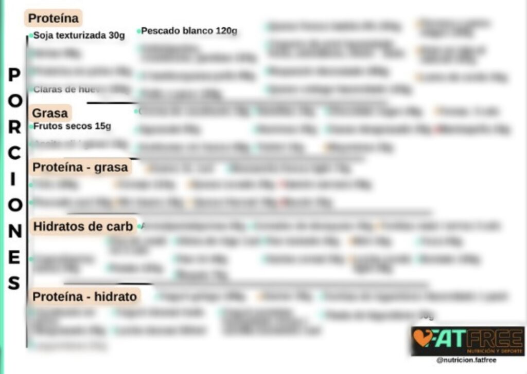 Trabajaremos con un método flexible, dividiendo los alimentos en grupos como carbohidratos, proteínas, grasas… Cada grupo tiene múltiples opciones con su cantidad específica (en gramos o unidades). Por ejemplo, en el grupo de proteínas, 1 porción puede ser 120 g de pescado blanco, 2 yogures de proteína de Hacendado o 30 g de soja texturizada; en grasas, podrás elegir 10 g de aceite de oliva, 15 g de frutos secos o 50 g de aguacate, entre otras tantas… Seguidamente te entregaré el reparto de tus comidas, en cada comida te especificaré la cantidad de porciones de cada grupo, por ejemplo, esto podría ser un desayuno: 3 porciones de carbohidratos, 1 de proteína y 1 de grasa, y tú decides las opciones según tus gustos. irás a la tabla y escogerás. Cada opción estará clasificada por un «semáforo nutricional»: verde para las opciones más saludables, ámbar para las moderadas y rojo para las que deben ser ocasionales, como mantequilla o leche condensada light.