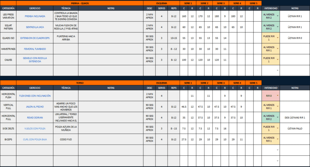 Diseñaré tu rutina en función de tus prioridades, el tiempo que tienes disponible y el material al que tienes acceso, para ello te pediré fotos de las máquinas de tu gym o su web para poder comprobarlo en primera persona. Llevaremos un seguimiento mediante una hoja de control, donde registrarás cargas, repeticiones y otros factores clave como nivel de estrés, saciedad, pasos diarios o calidad del descanso, entre otros tantos. Además, me enviarás videos para revisar tu técnica y corregir lo que sea necesario.